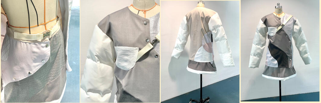She used scrap fabrics from previous projects and shredded old T-shirts to make black yarns. I also used techniques like silkscreen printing to create prints on the garment.